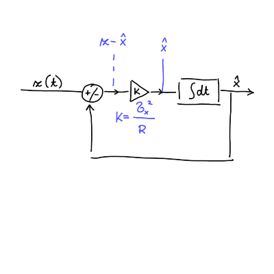 \[ \dot{\hat{x}} (t) = \frac{\hat{\sigma}_x ^2}{R} \left( z - \hat{x} \right). \]