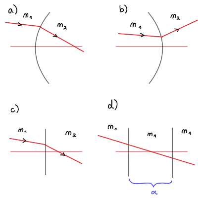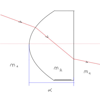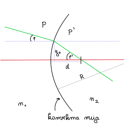 \[ A_{conc} = \begin{bmatrix} 1 & 0 \\ \frac{1}{R} \left( \frac{n_1}{n_2} - 1 \right) & \frac{n_1}{n_2} \end{bmatrix} \] c) ravna meja \( R \to \infty \)